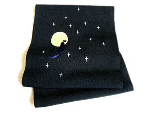 満月をモチーフとした刺繍と、その満月を眺めるように佇むネコが
